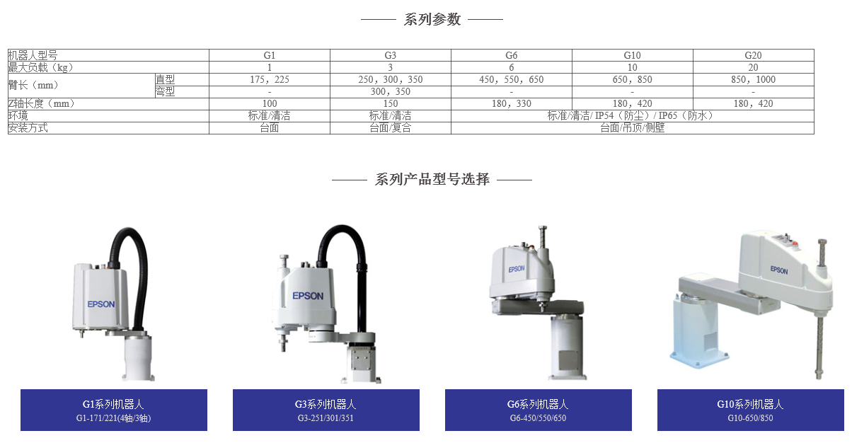 爱普生G系列机器人拥有高速度、高精度和低震动特性。可满足任意应用需求,其中包括支持多任务、洁净车间、防静电或冲洗环境中使用的机型。