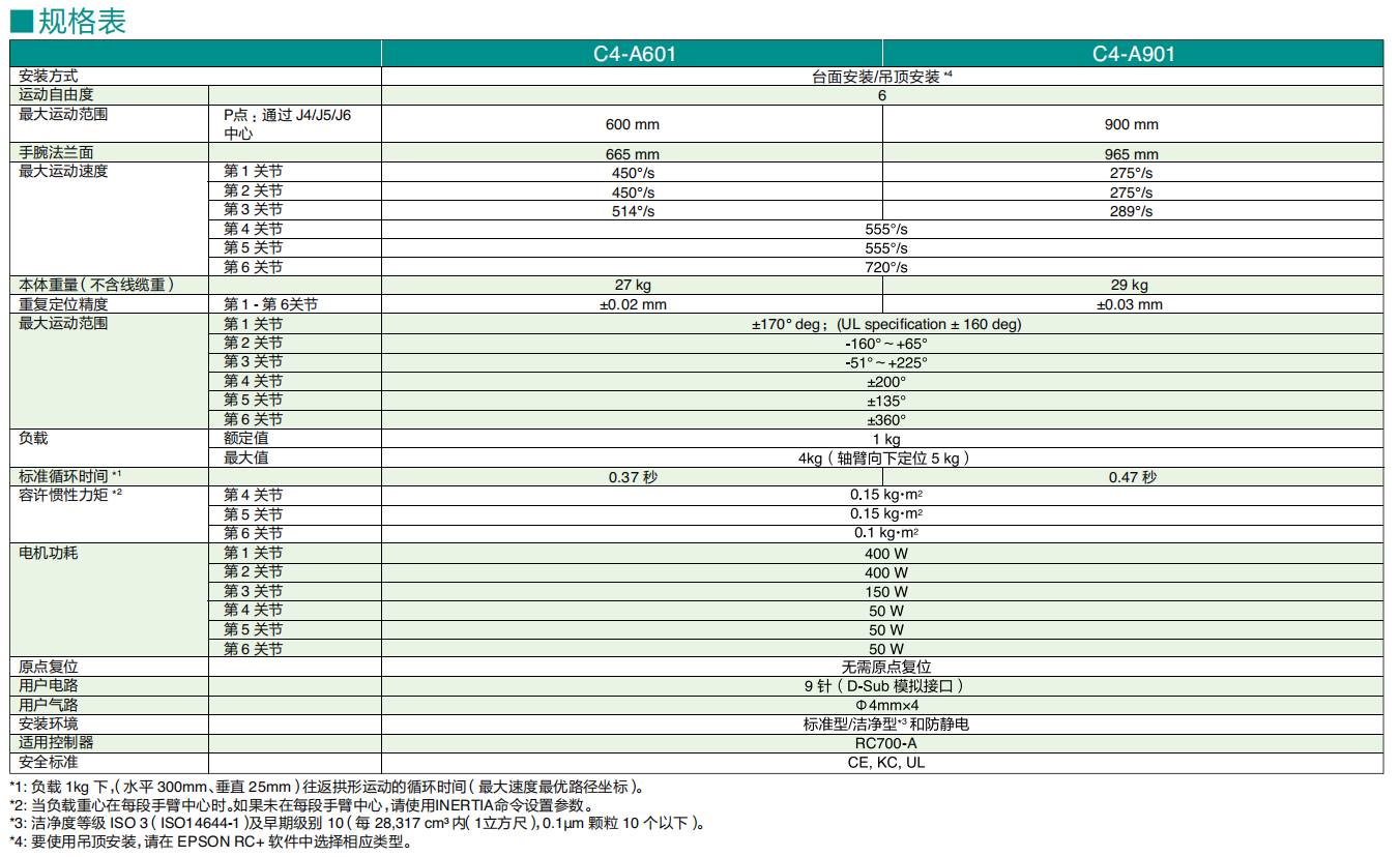Epson ProSix C4 工作范围600mm,有效载荷 4kg(手腕垂直向下时可以到5kg),动力保持平稳。通过新开发的爱普生传感技术实现振动控制。新的Epson ProSix C4L的工作范围达到900mm,但由于机械手设计得非常细长,因而仅需要极少的空间,因此,在空间的充分利用这个方面,其是同类产品所无法比拟的!